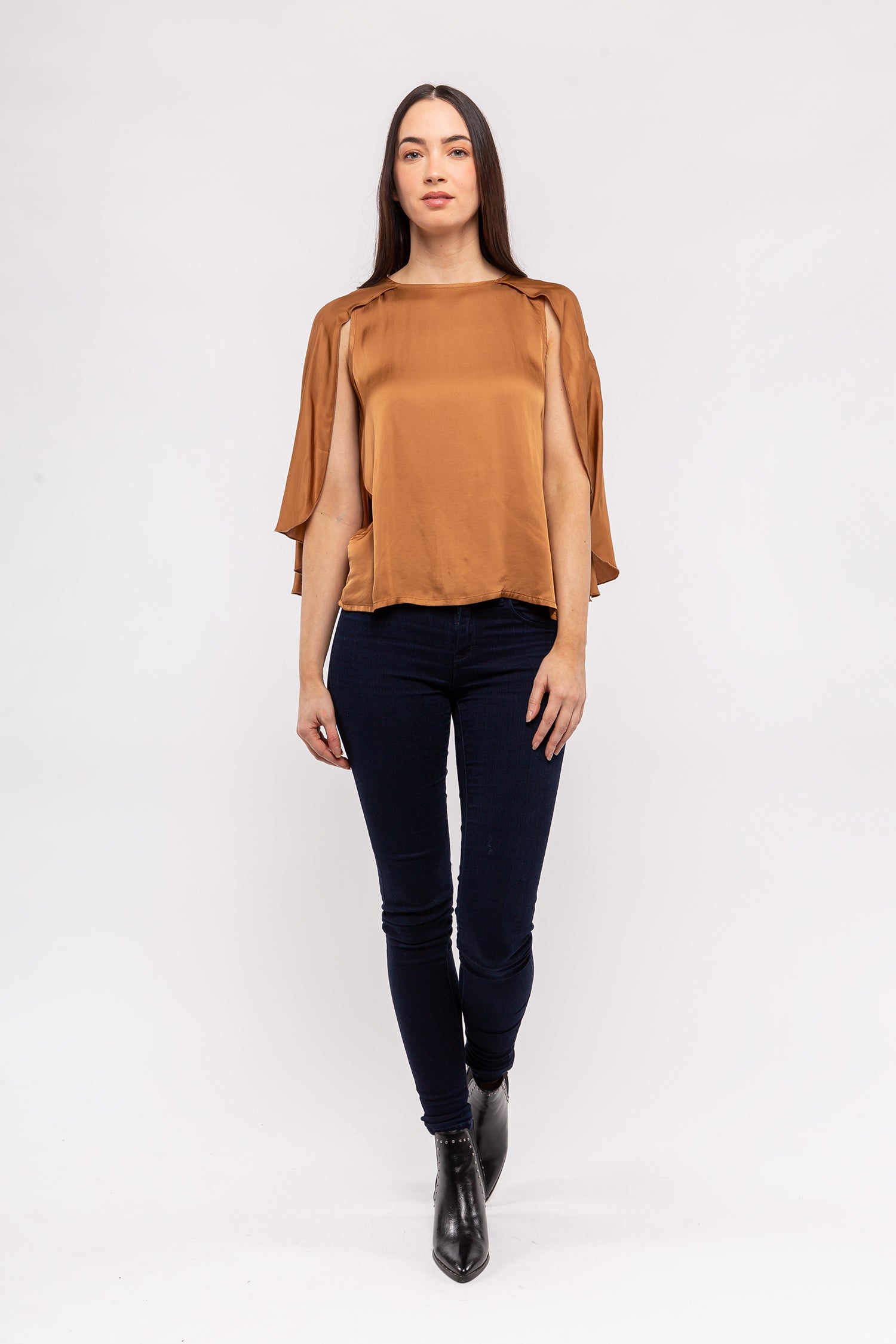 Long Sleeve Top. Fabric: 100% Viscose. Available in colors: Black, Bronze.