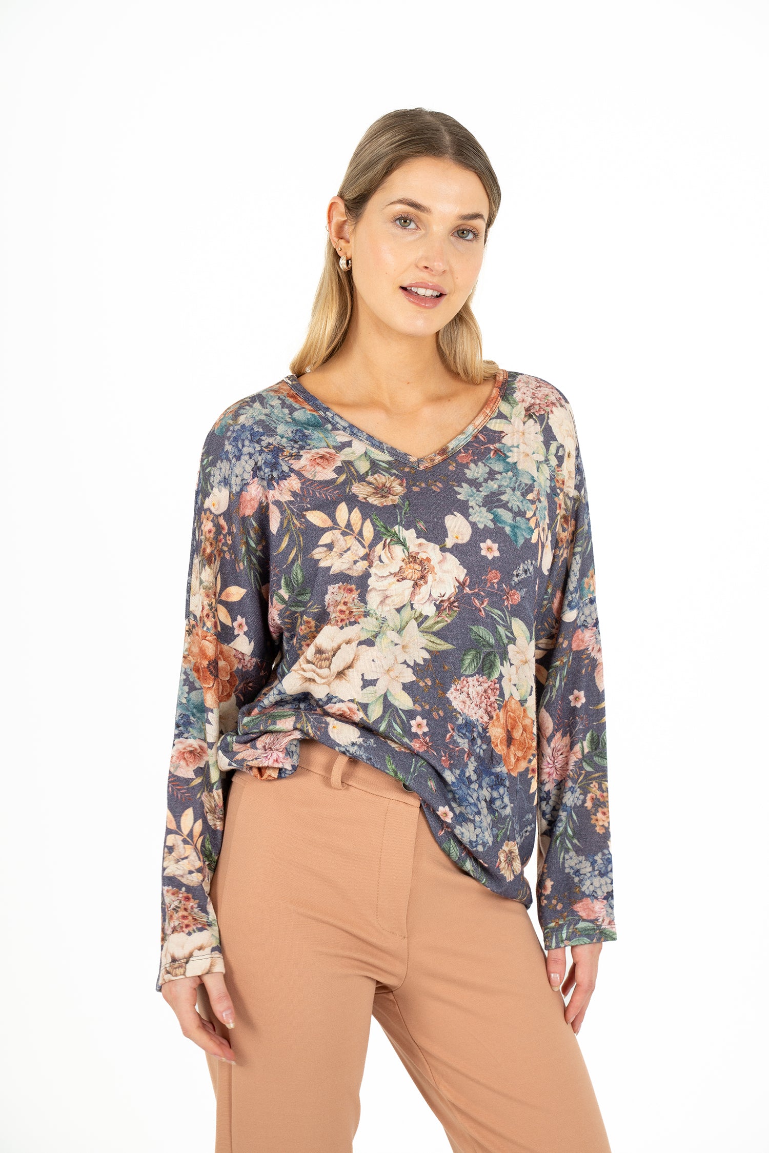 Women's knit v-neck long sleeve printed top. Composition: 50% Viscose, 29% Polyester, 21% Nylon.