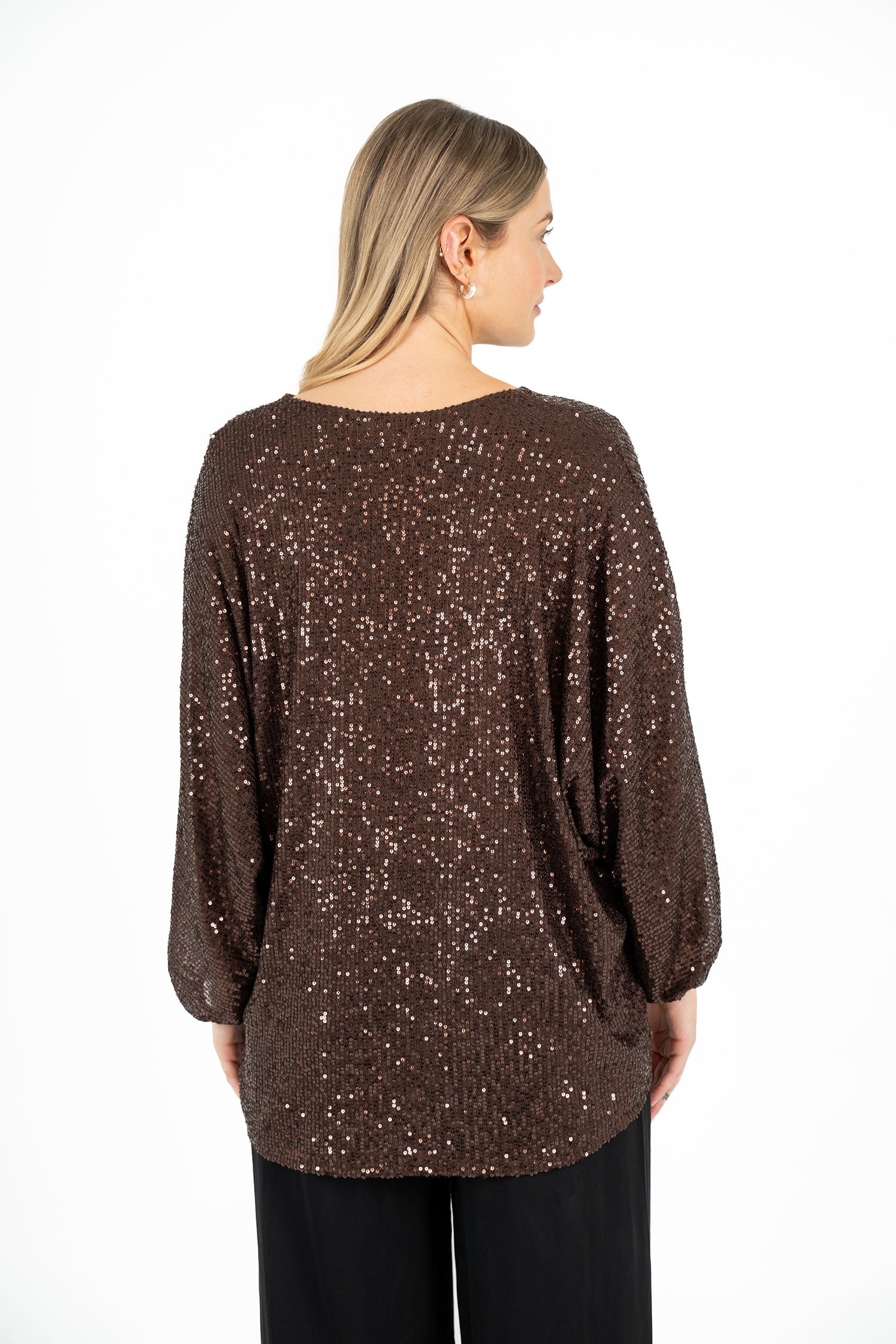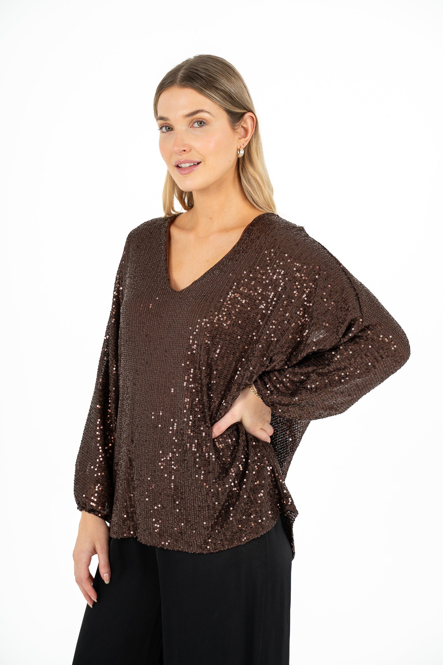 Women's knit v-neckline sequin top, with set-in long sleeves. Composition: 100% Polyester.