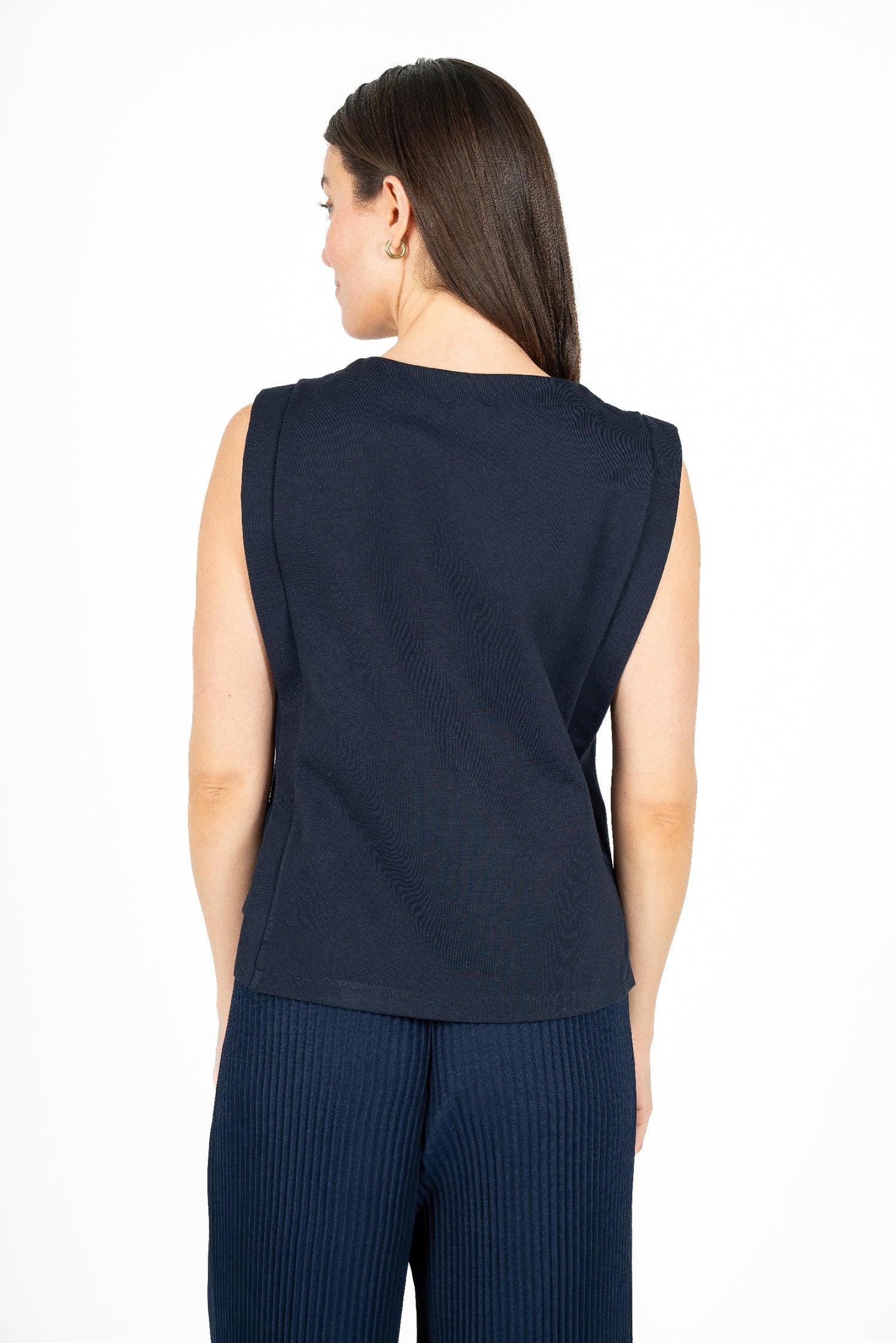 Women's sleeveless crew-neck knit top, with side panel inserts. Composition: 66% Viscose, 29% Nylon, 5% Elastane.