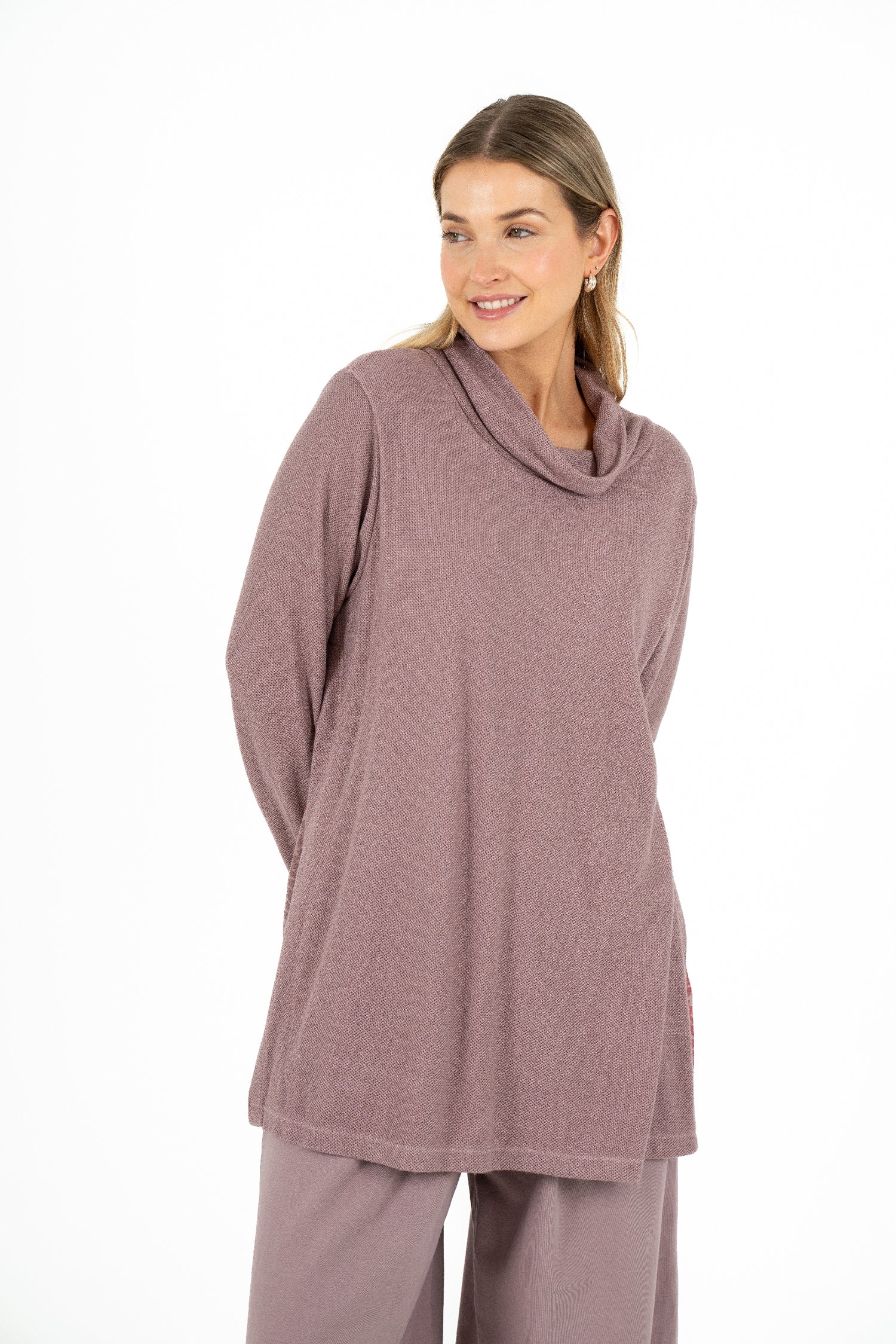 Women's cowl-neck long sleeve tunic, with loose flap panels at the side seams. a combination of solid knit and printed woven materials. Composition: Knit (Solid): 75% Viscose, 20% Polyester, 5% Elastane | Woven (Print): 100% Viscose.