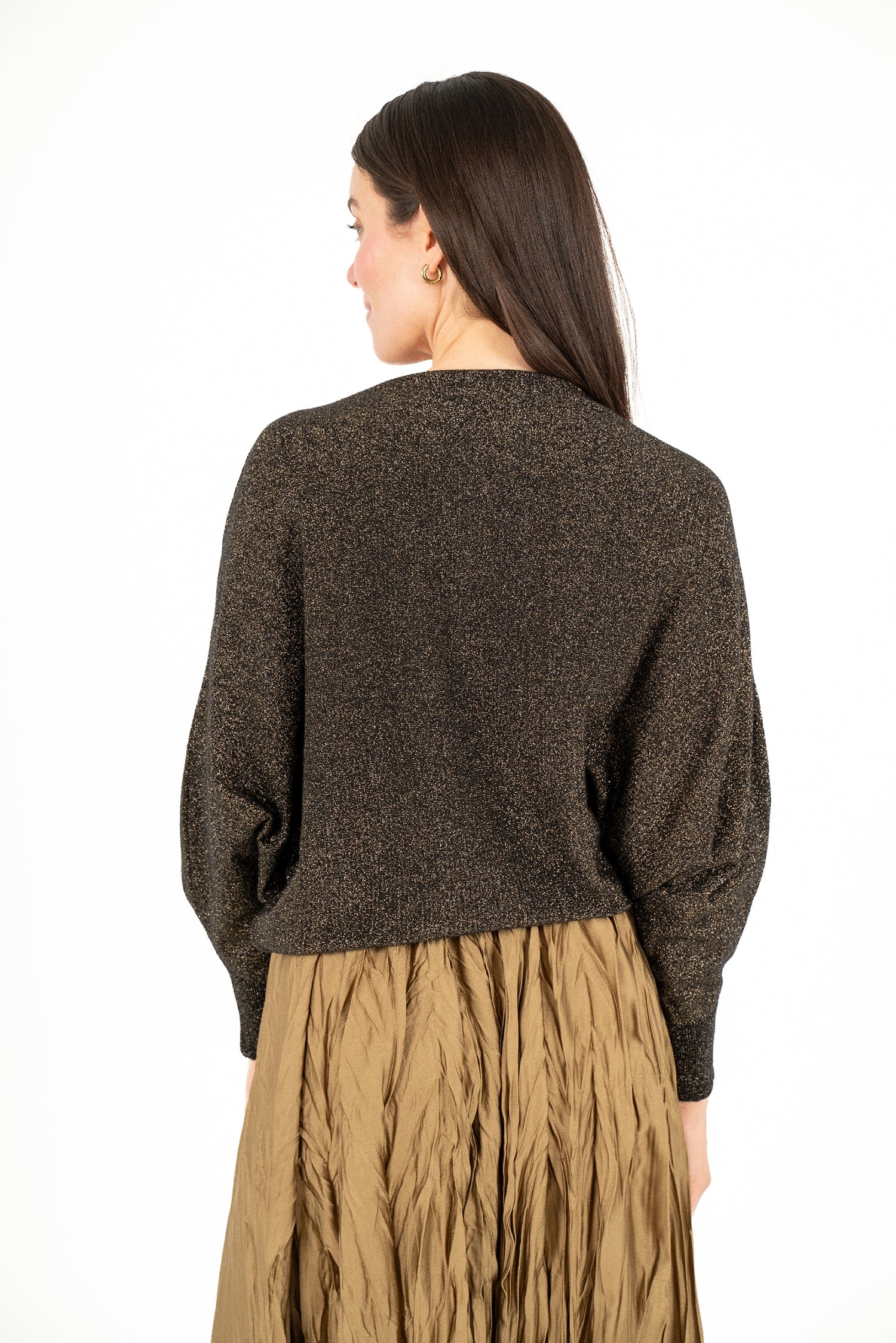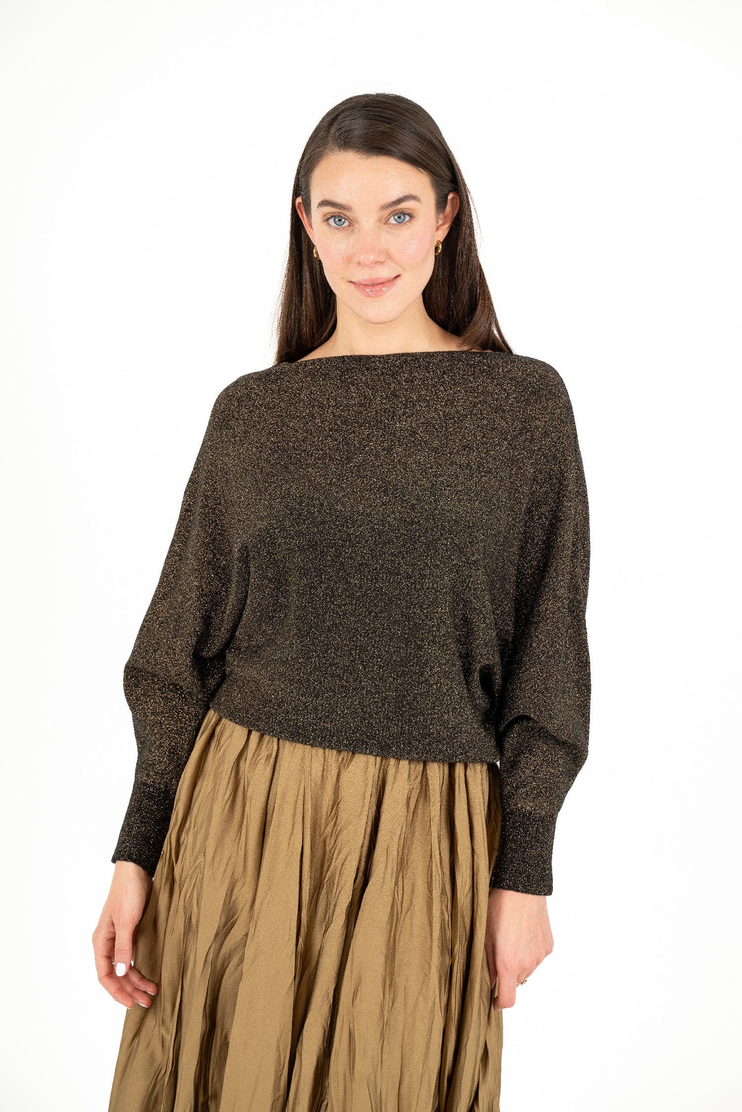 Women's knit boat-neck long sleeve sweater, with bat-sleeves. Composition: 80% Viscose, 20% Metallic Filament.