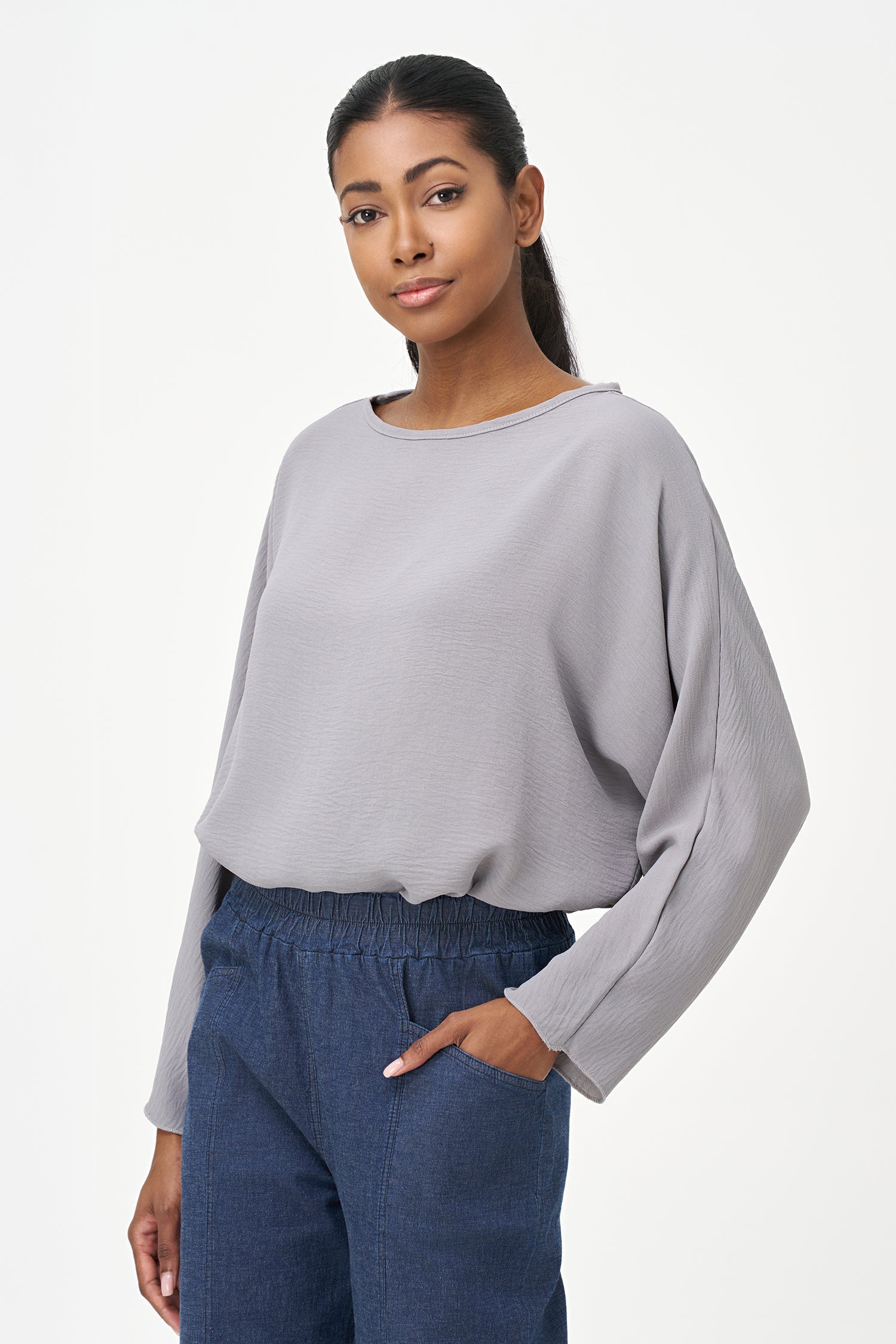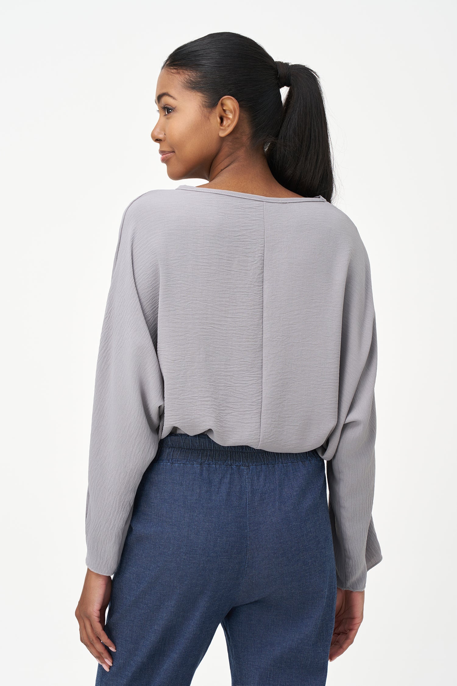 Women's Woven Long Sleeve V-Neck Top With A Boat-Neckline. Made of 100% Polyester.