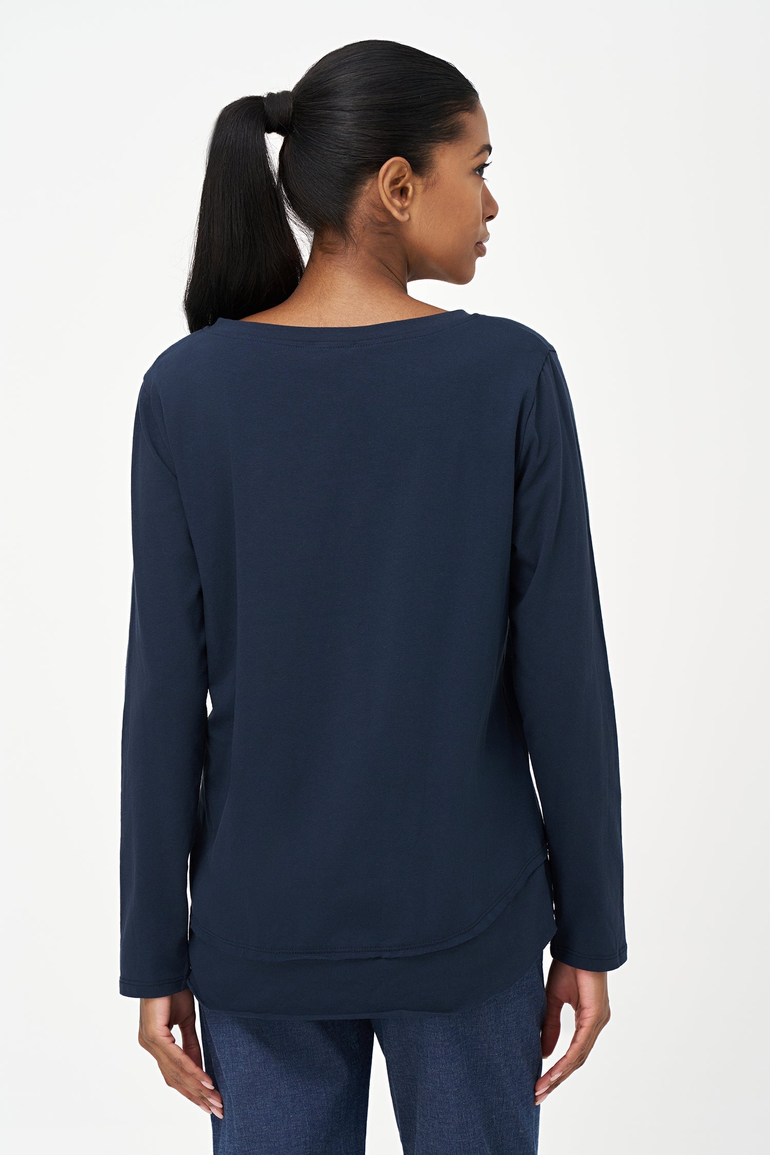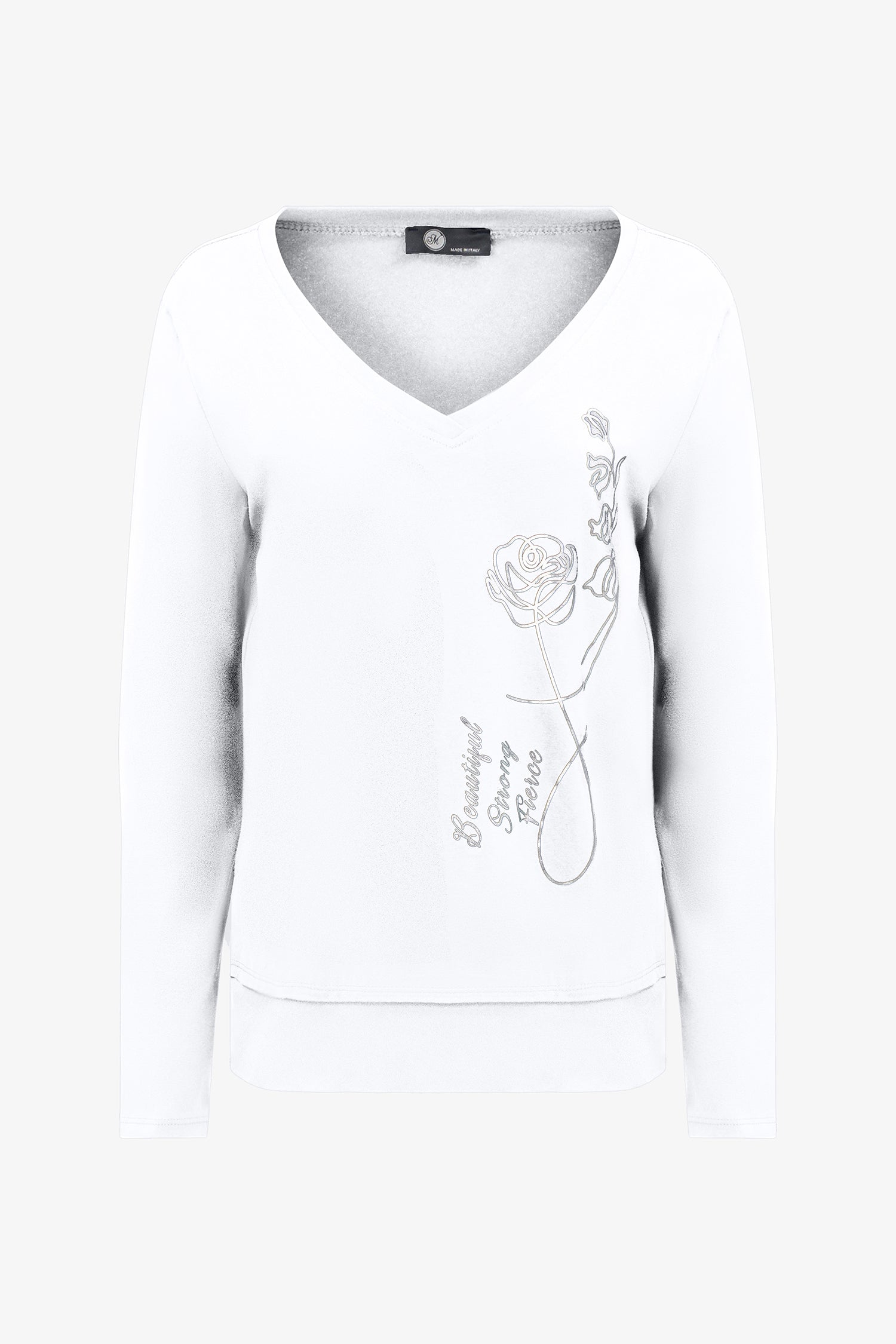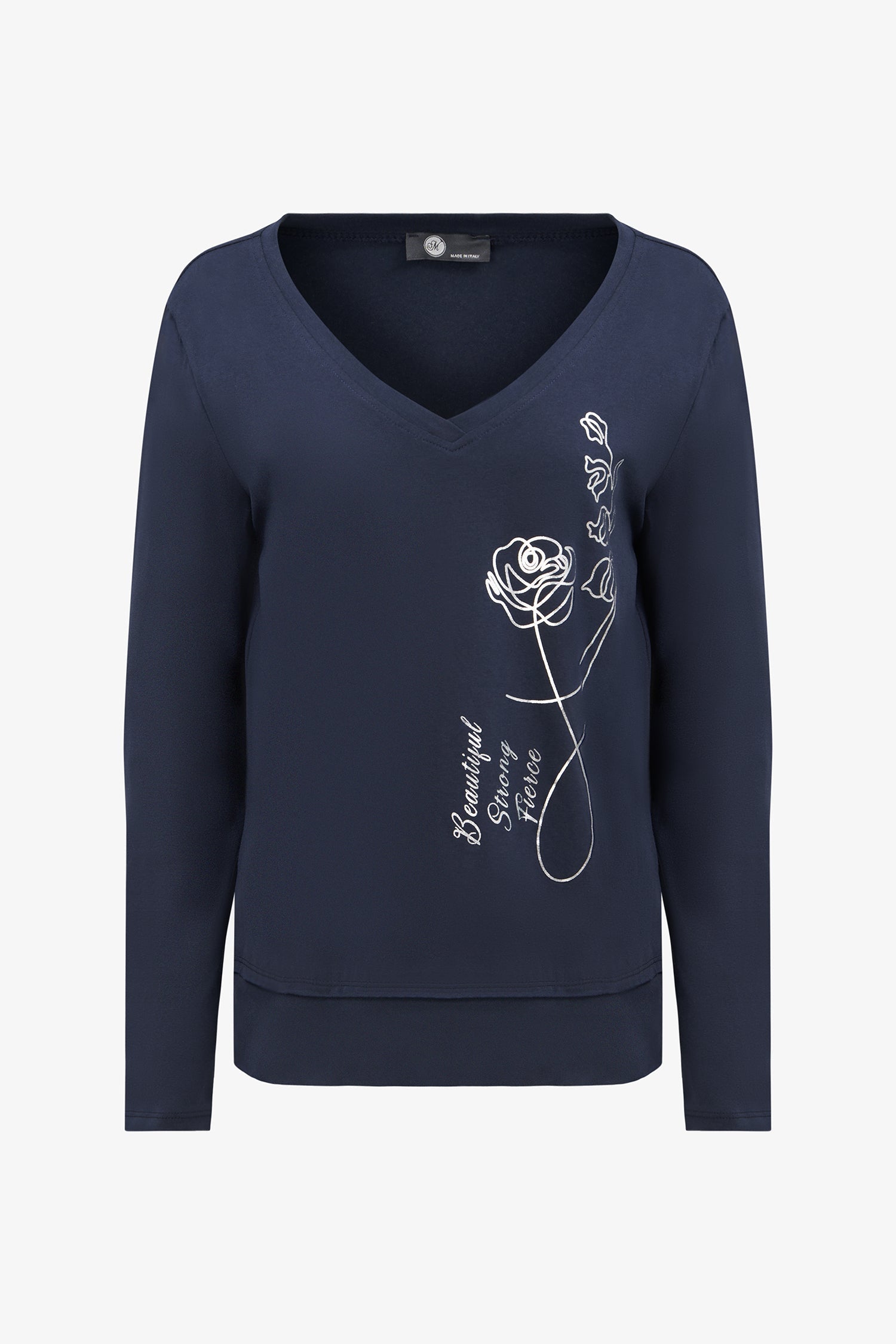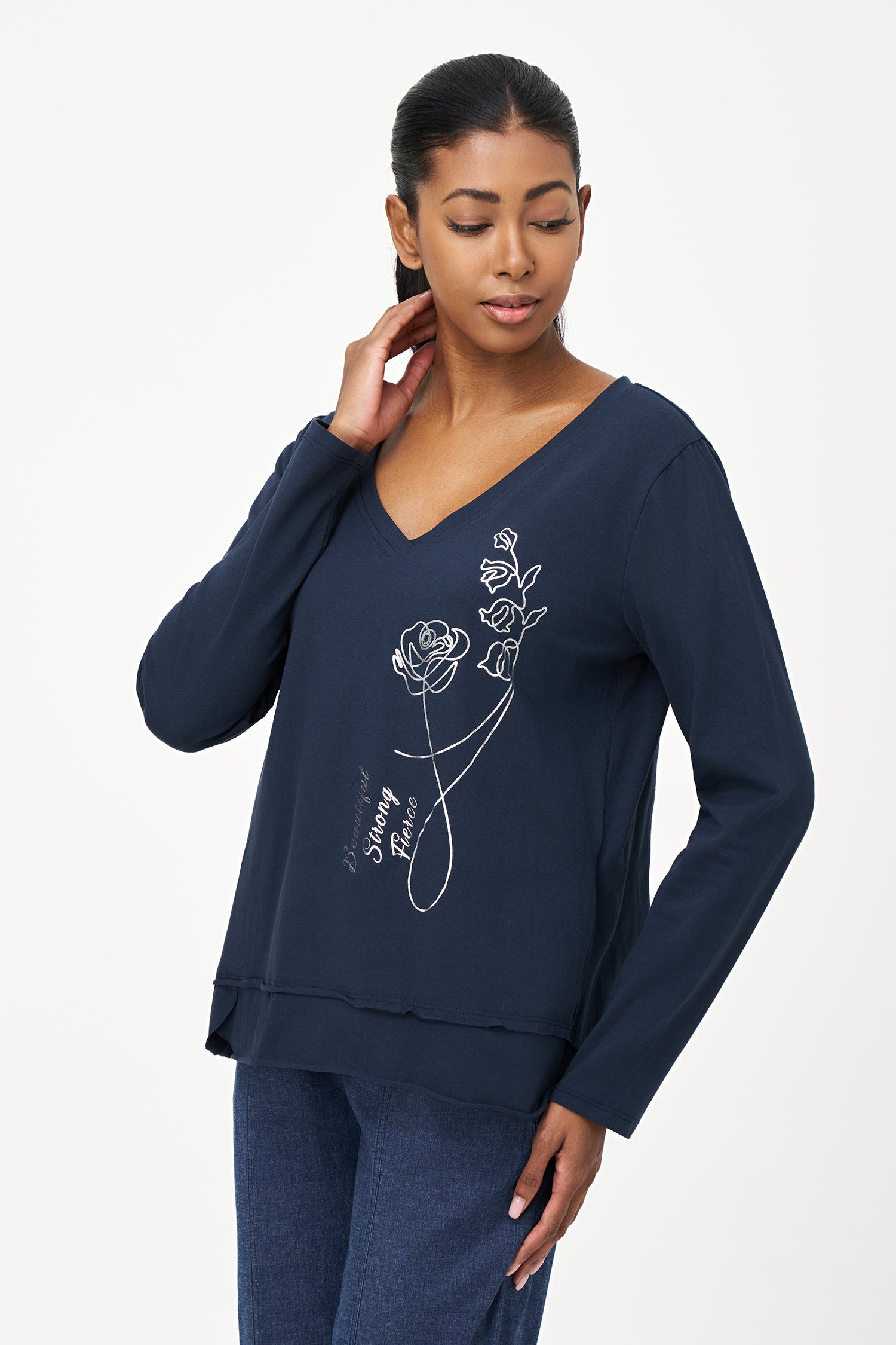 Women's Knit V-Neckline Long Sleeve Top, With A Front Scooped Uneven Hemline And Placement Print. Made of 95% Cotton, 5% Elastane.