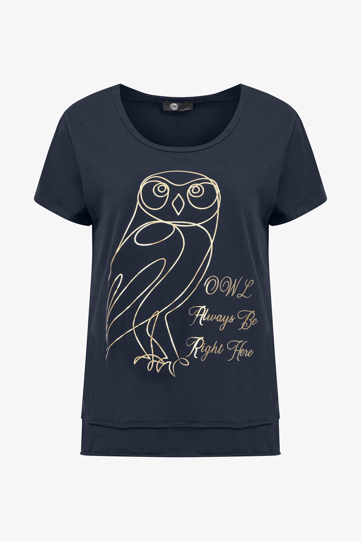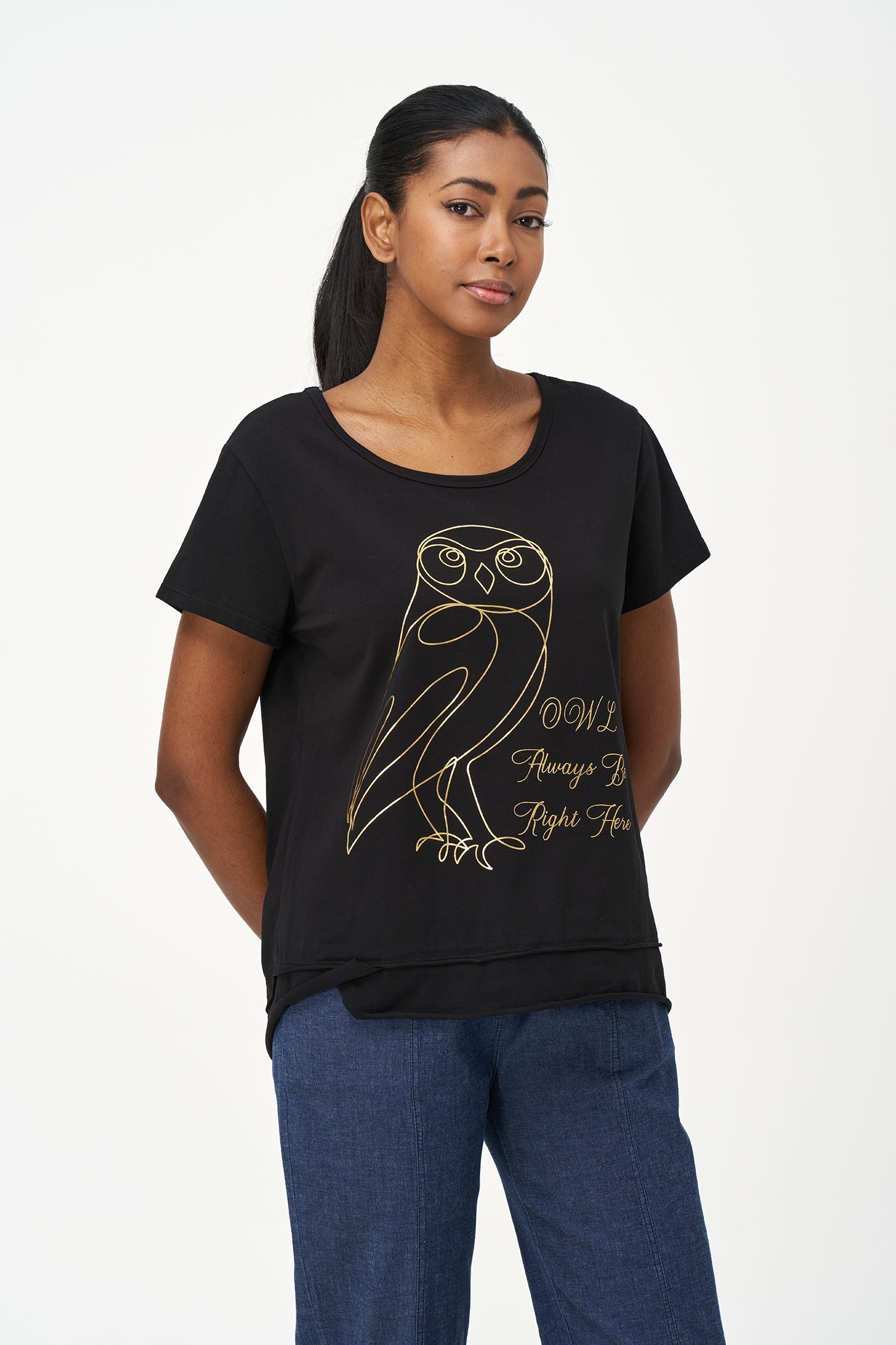 Women's Knit Crew-Neckline Short Sleeve Top, With A Scooped Un-Even Hemline And A Placement Print. Made of 95% Cotton, 5% Elastane.