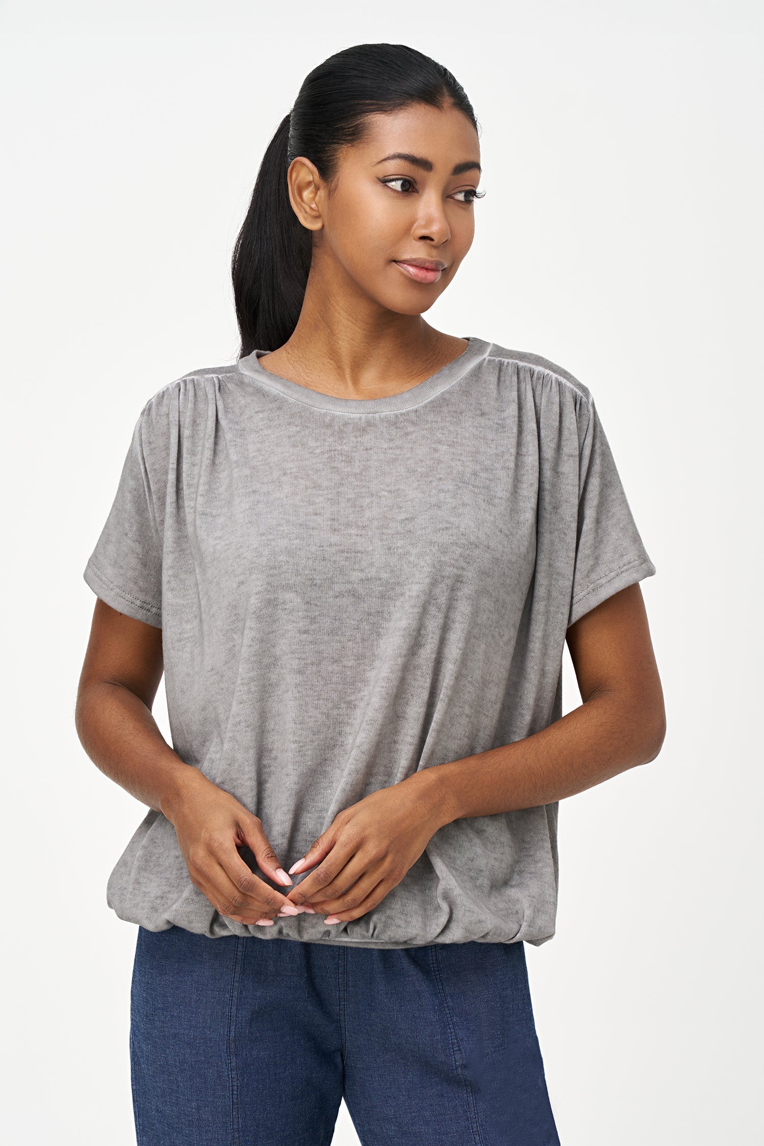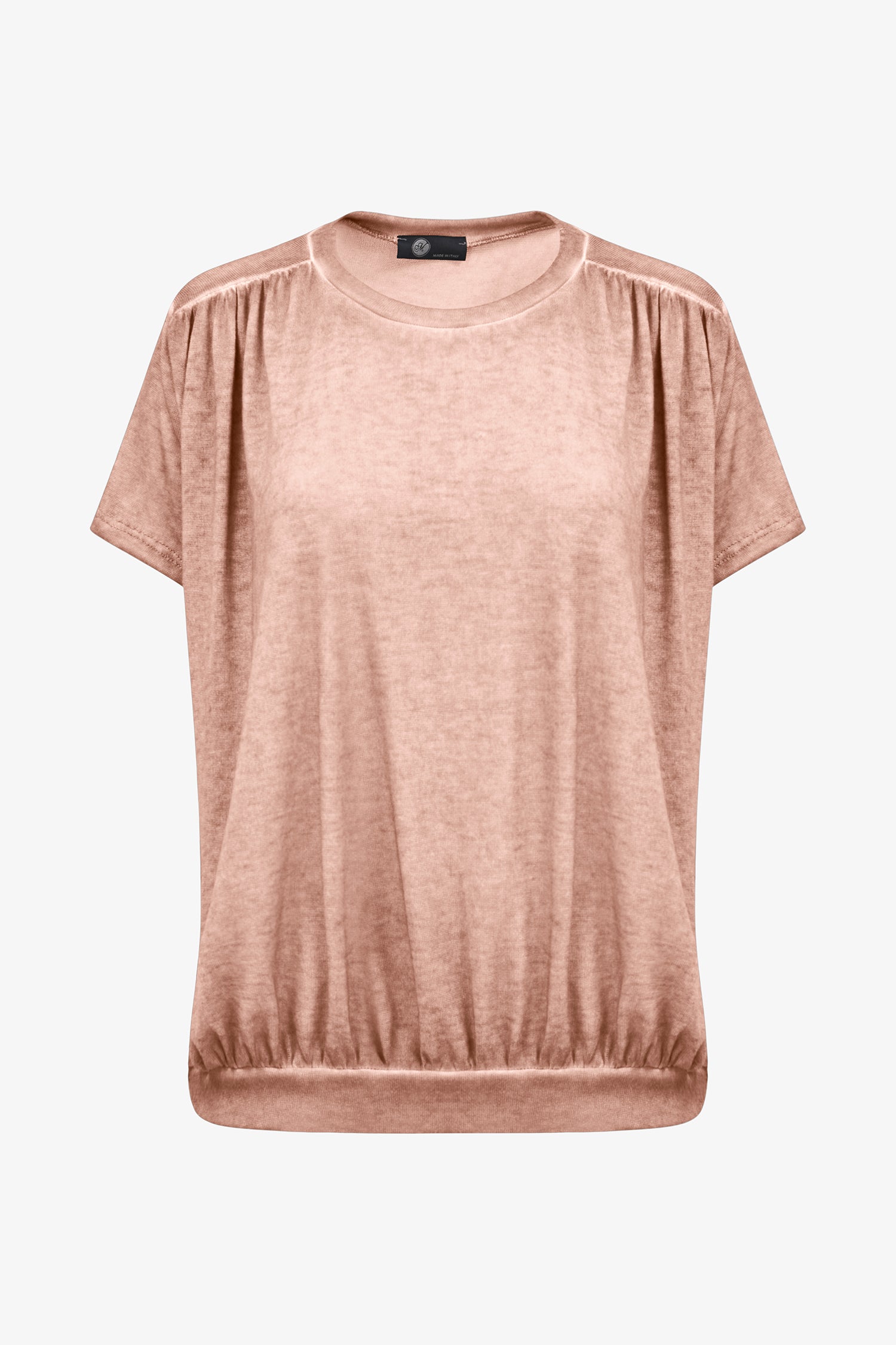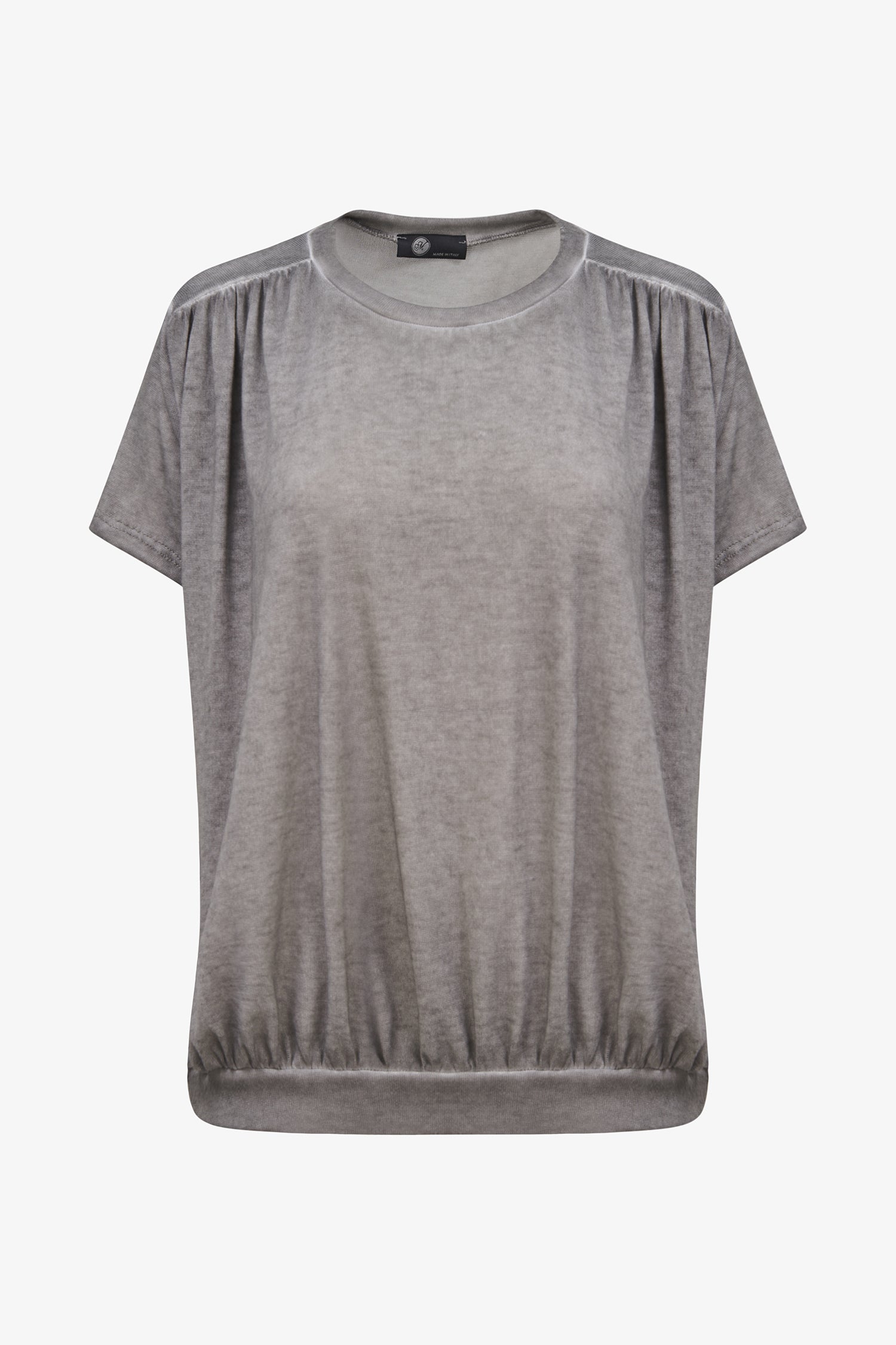 Women's Knit Short Sleeve Crew-Neck Top, With Ruched Shoulder Seams And Ruching Into The Waistband. Made of 80% Viscose, 20% Polyester.