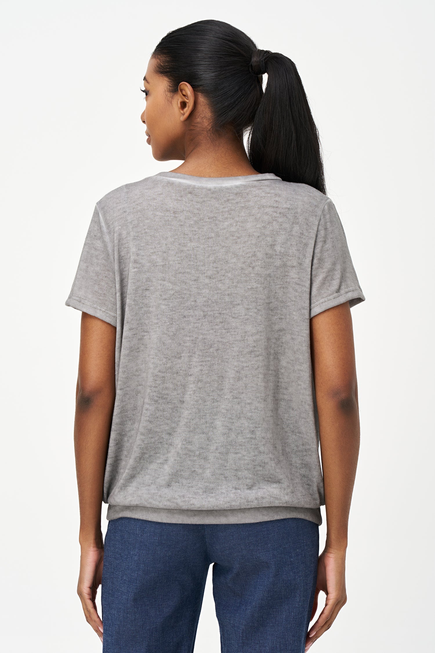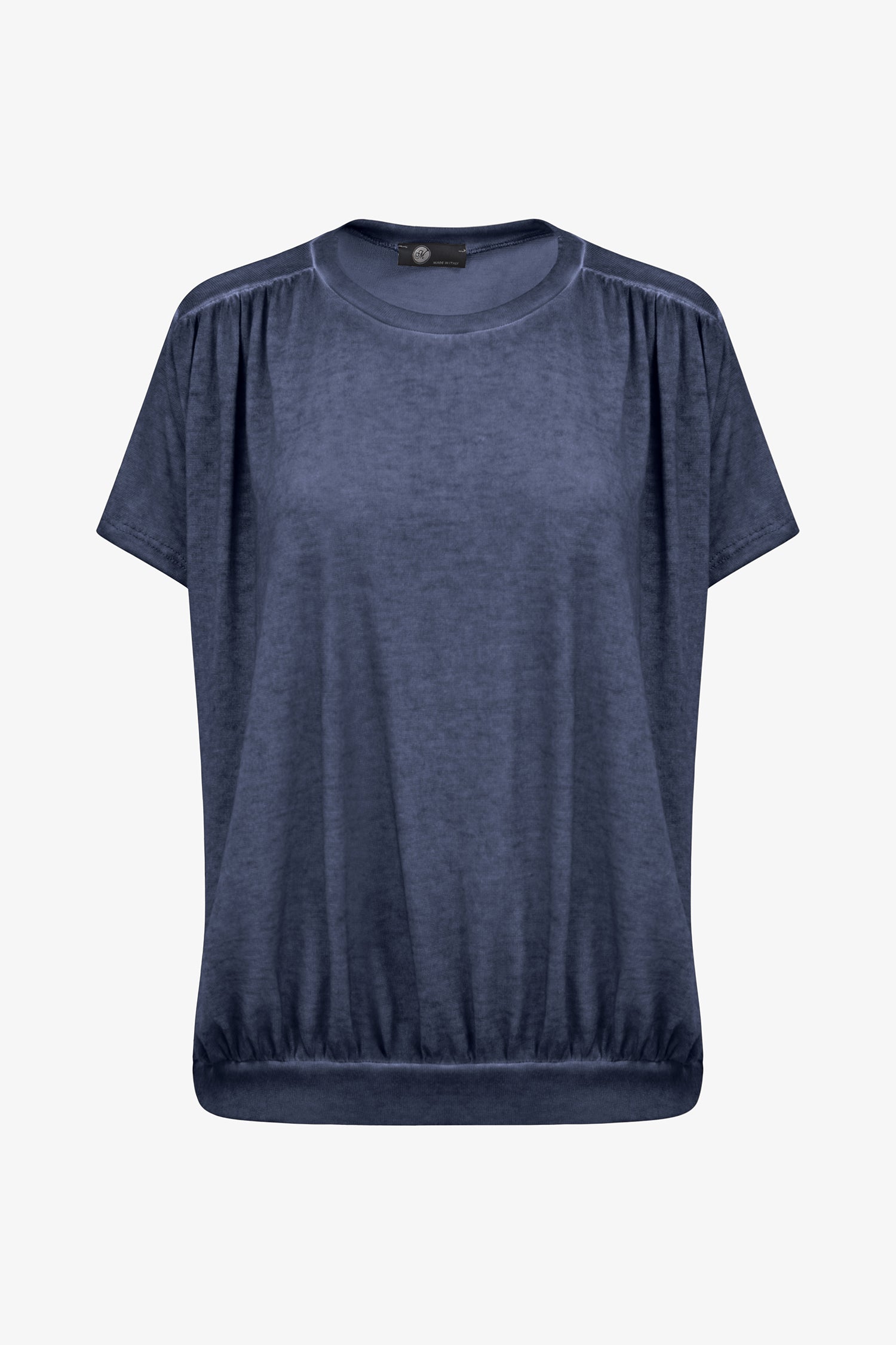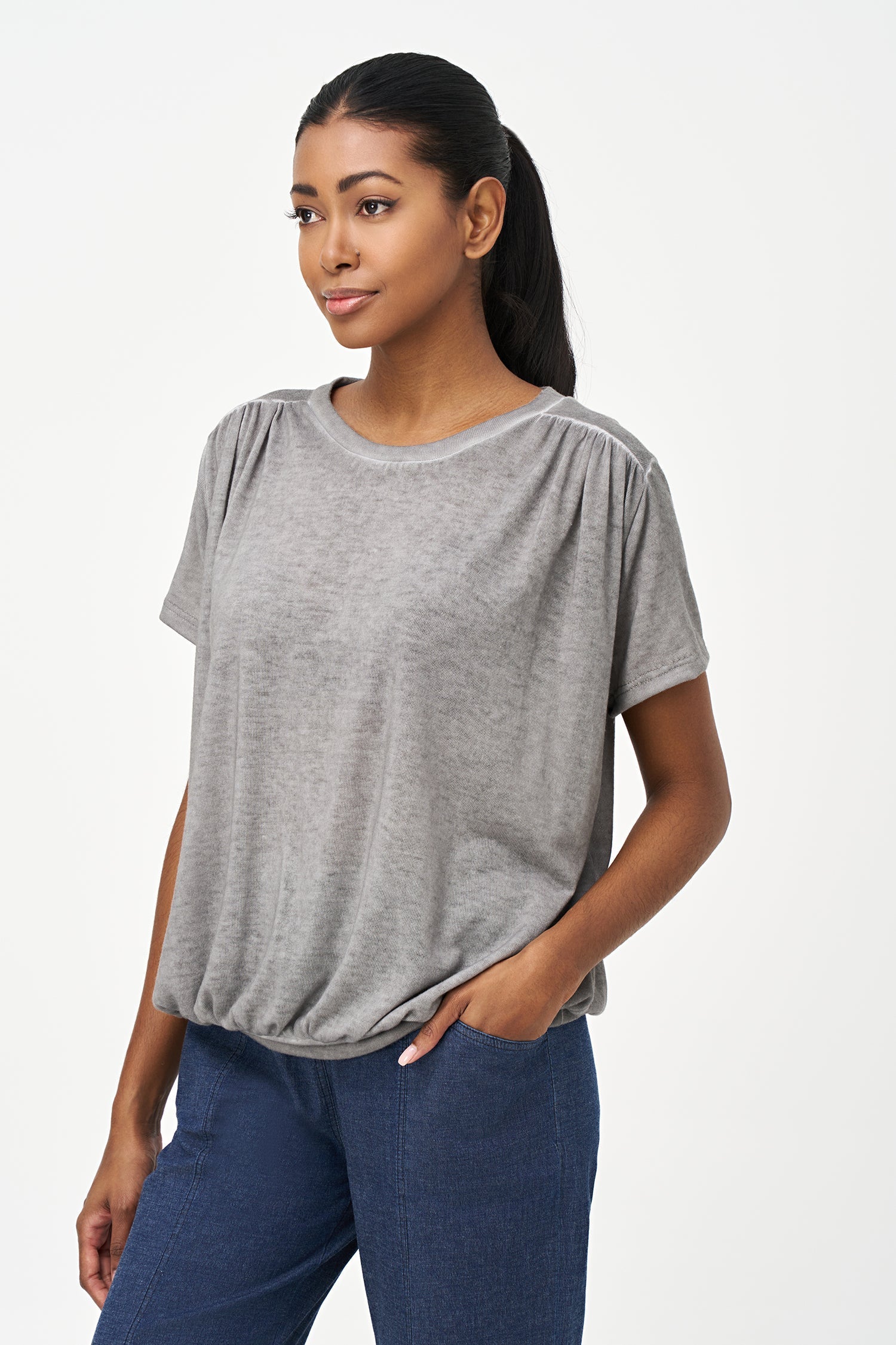 Women's Knit Short Sleeve Crew-Neck Top, With Ruched Shoulder Seams And Ruching Into The Waistband. Made of 80% Viscose, 20% Polyester.