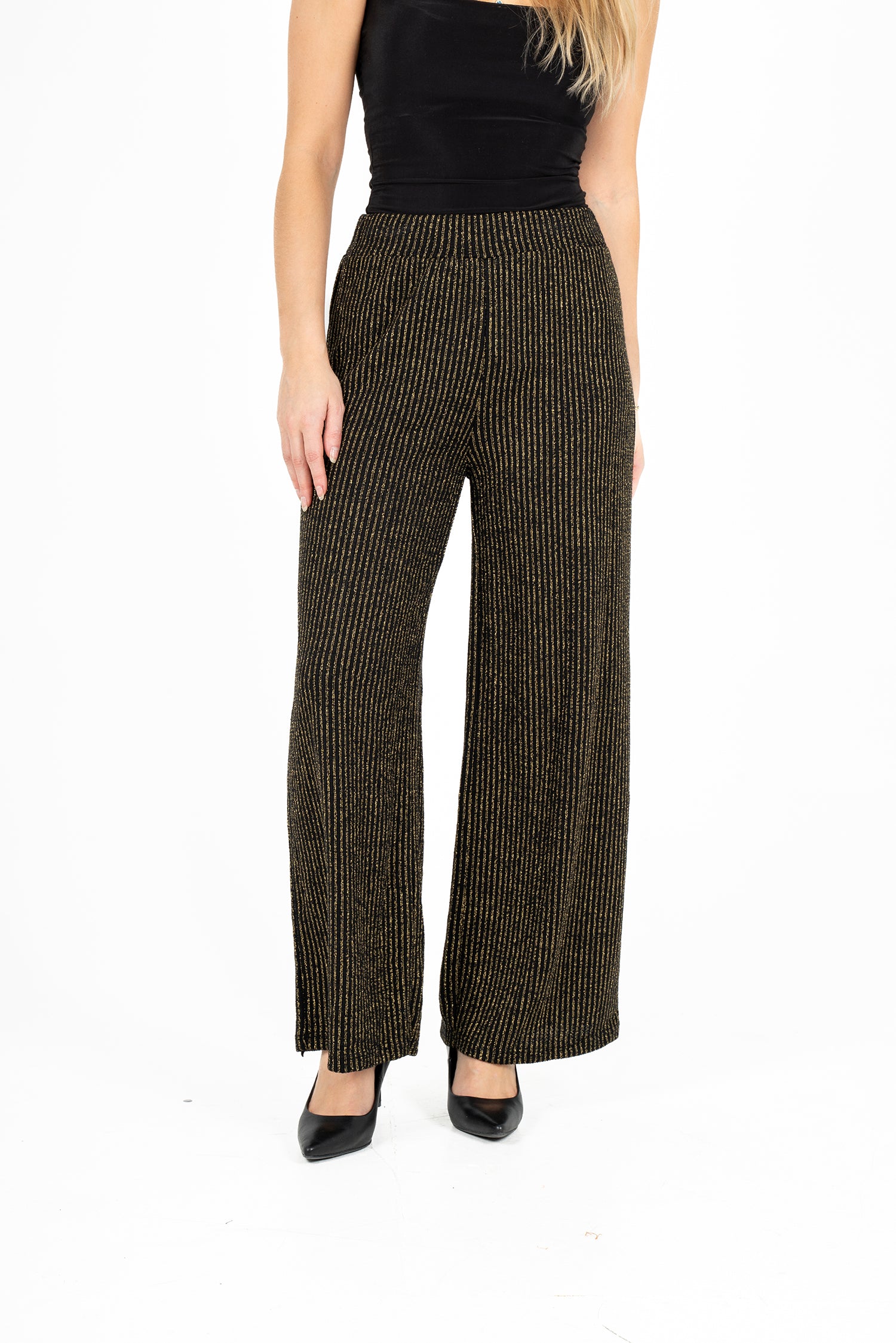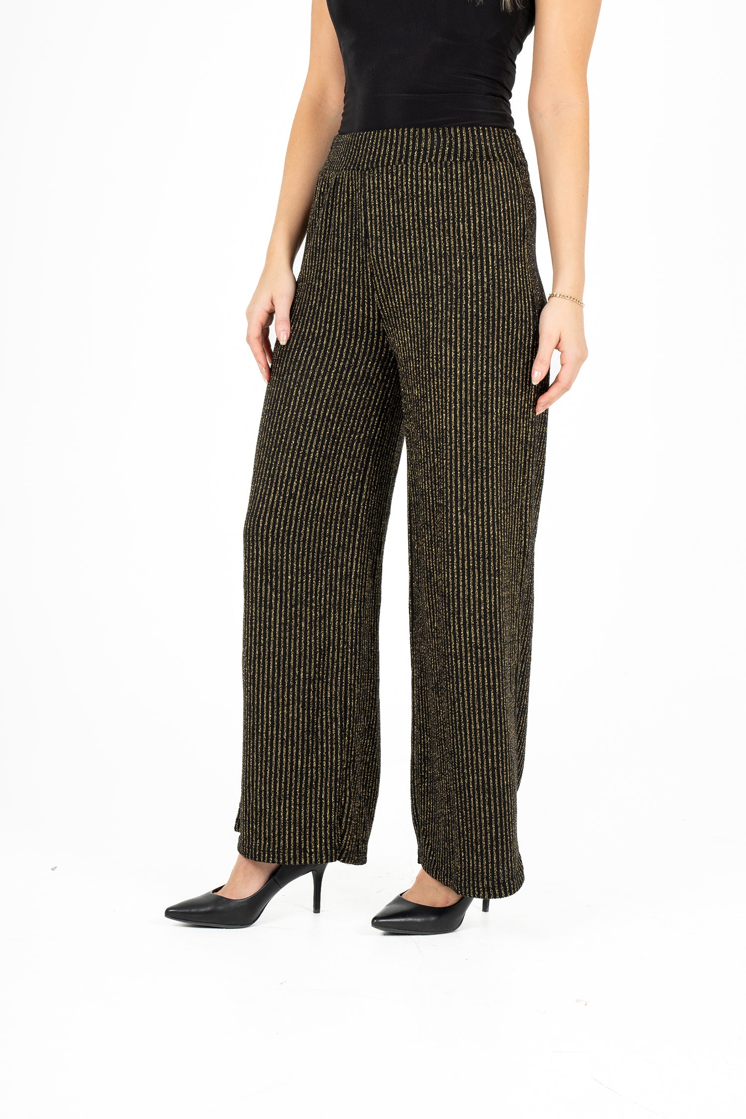 Women's knit pull-on wide leg pants with gold filament thread stripe detailing. Composition: 80% Viscose, 15% Polyester, 5% Elastane.