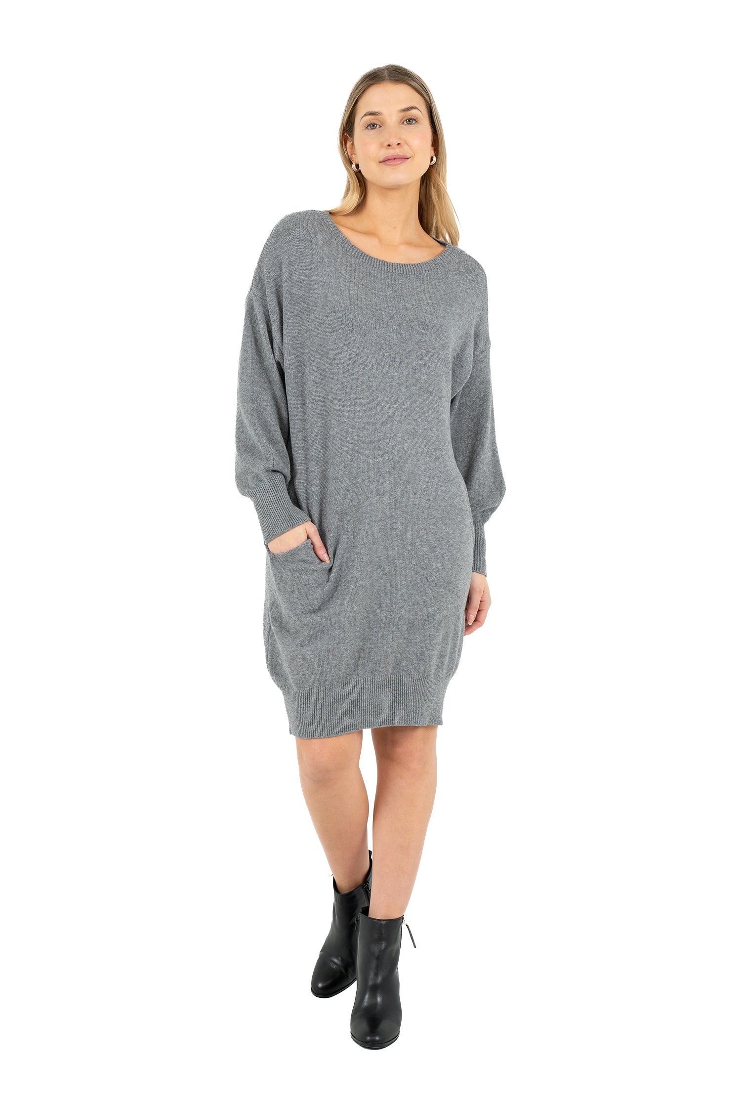 Women's knit dress, with a crew-neckline, long sleeves and side seam pockets . Composition: 52% Viscose, 18% Wool, 15% Polyester, 15% Polyamide.