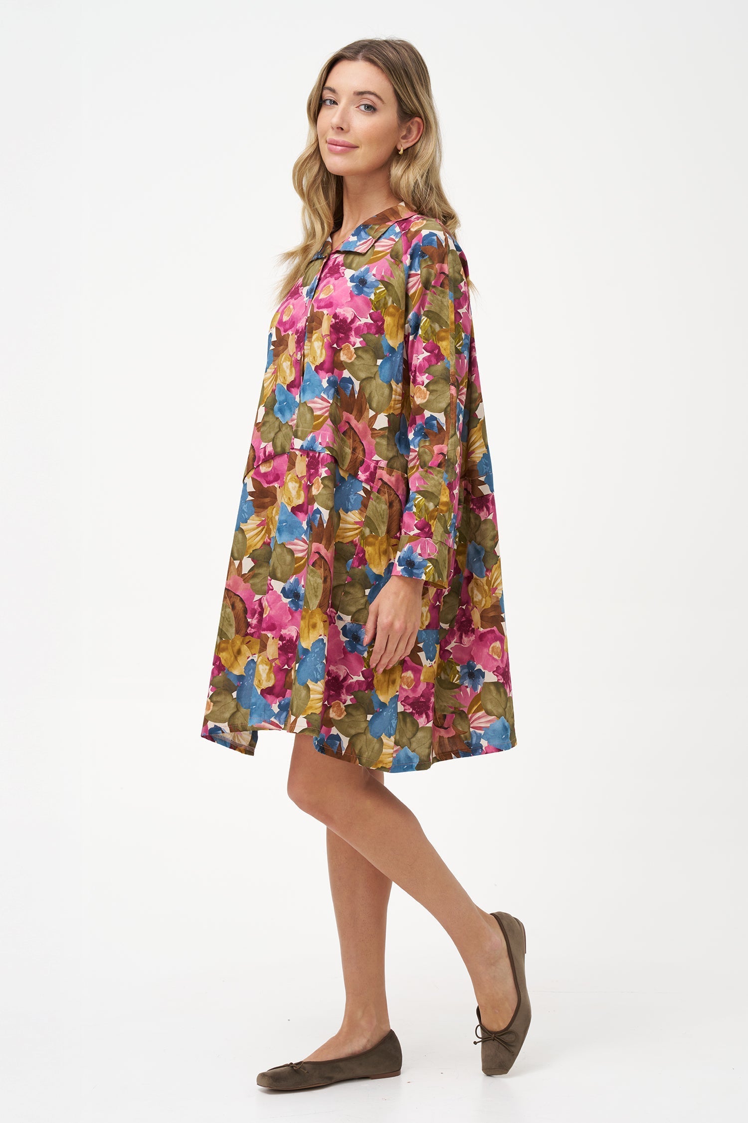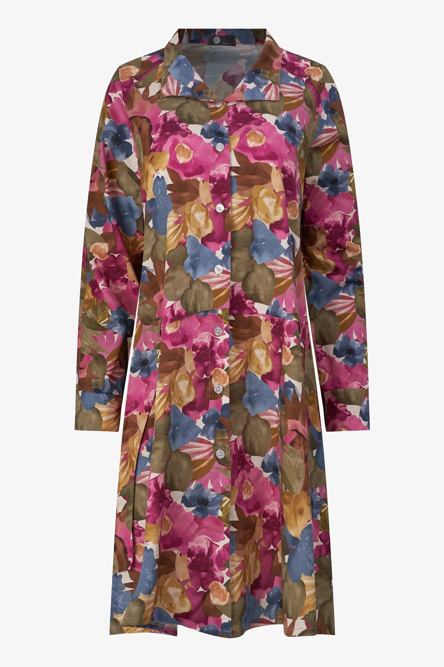 Women's Woven Stand Collar Button Down Tunic-Length Shirt, With Patch Pockets. Made of 100% Cotton.