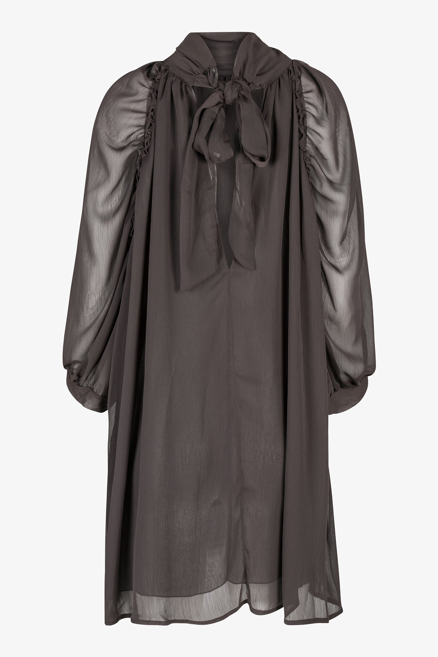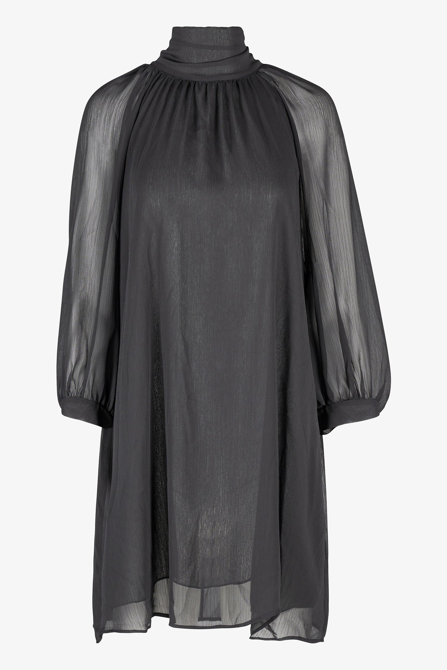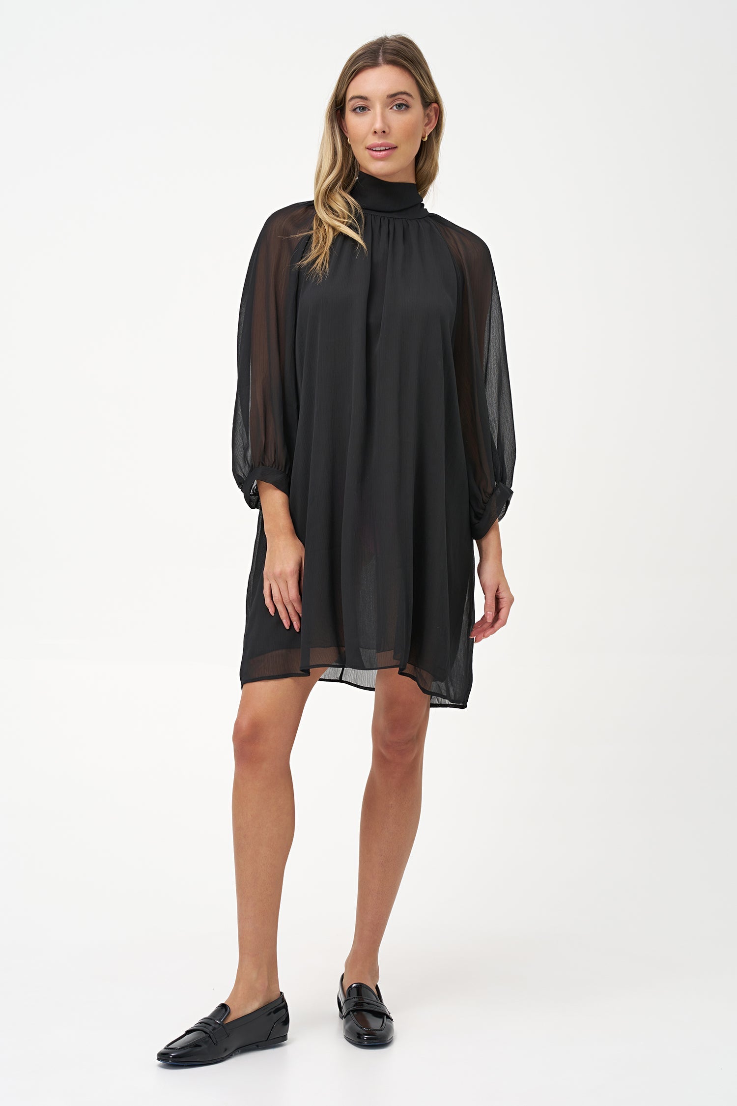 Women's Woven Sheer (Self-Lined) Mock-Neck Knee-Length Dress, With A Self-Tie Collar At The Back, And 3/4 Length Baloon Sleeves. Made of 100% Polyester.