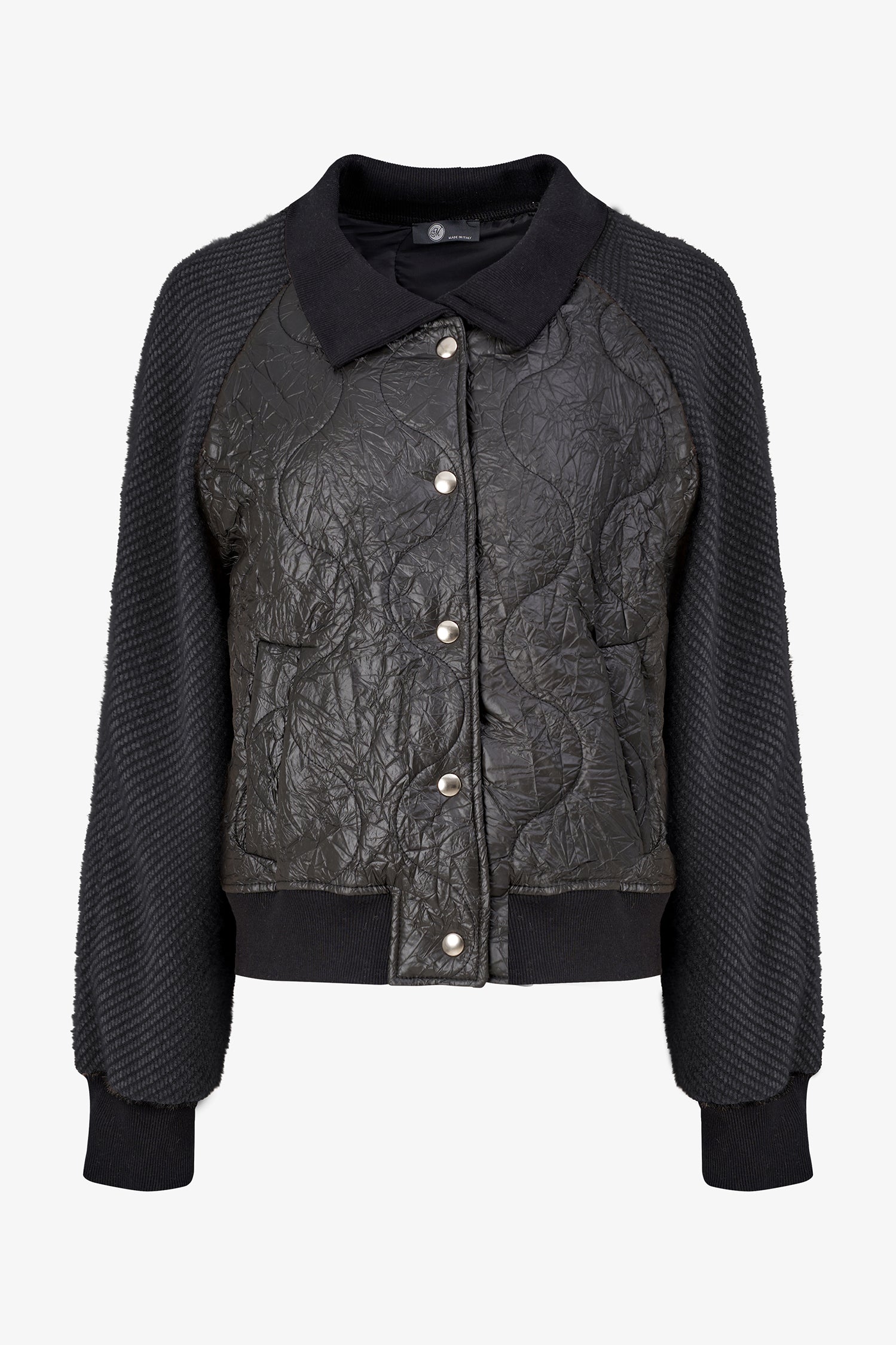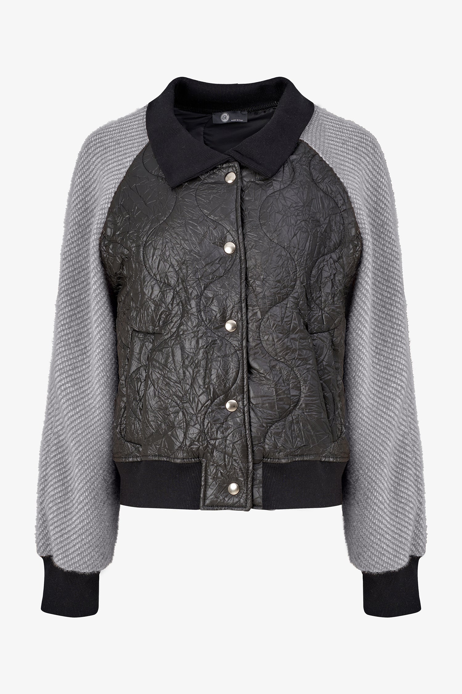 Women's Knit & Woven Combo Snap-Button Front Bomber Jacket, With Long Sleeves. Made of 100% Polyester.