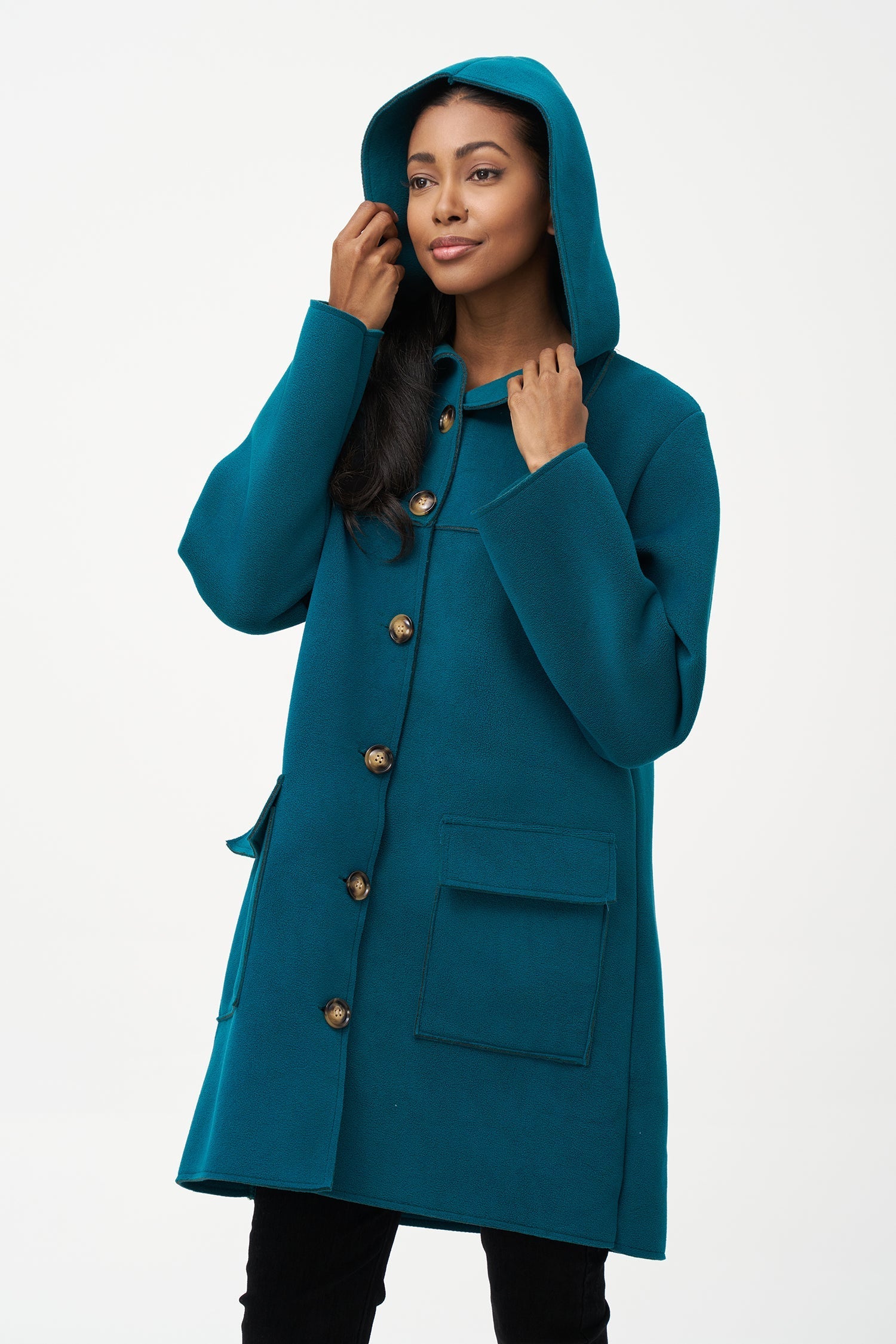 Women's Woven Mid Length Button Down Coat, With Hood And Patch Pockets. Made of 60% Viscose, 35% Polyester, 5% Elastane.