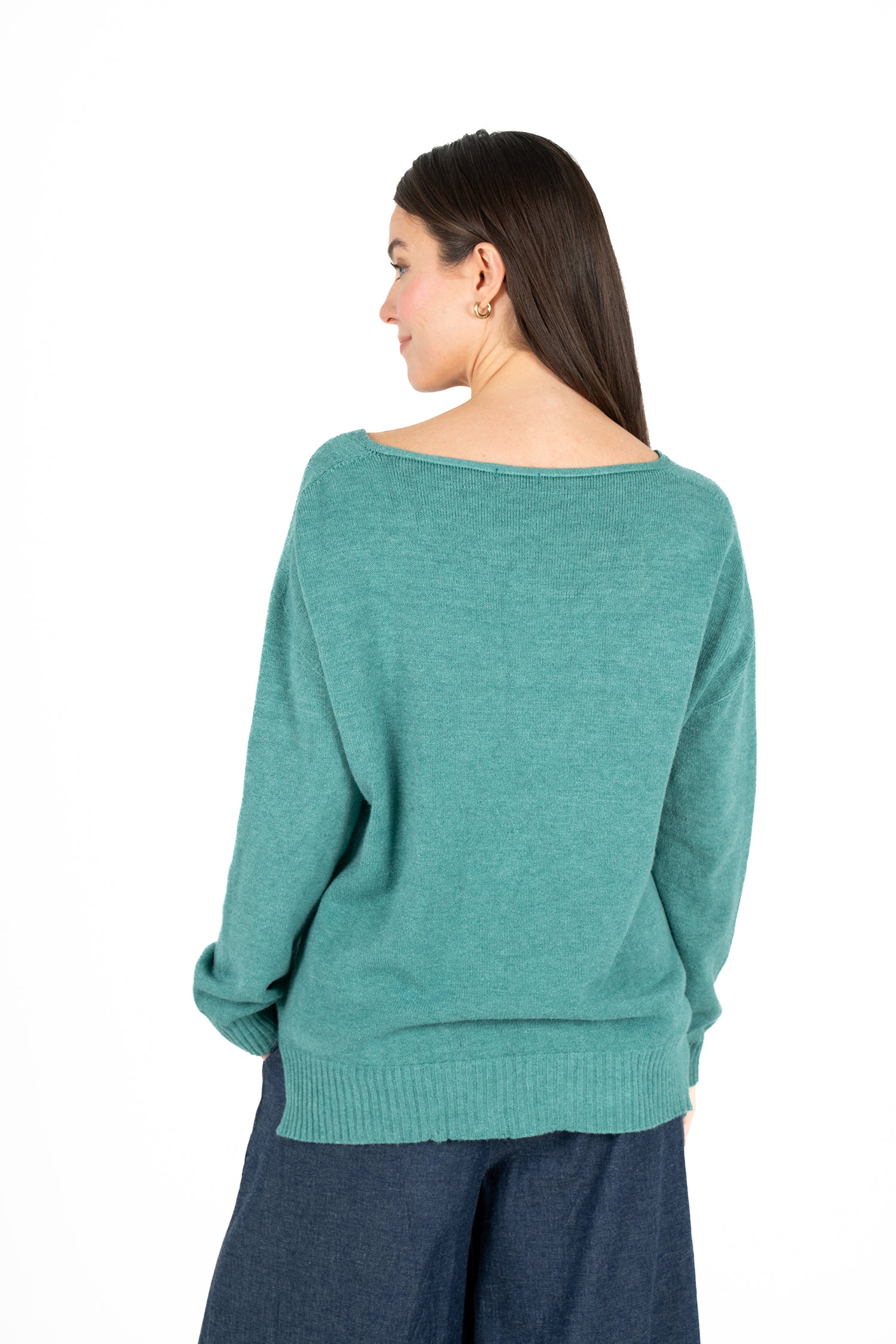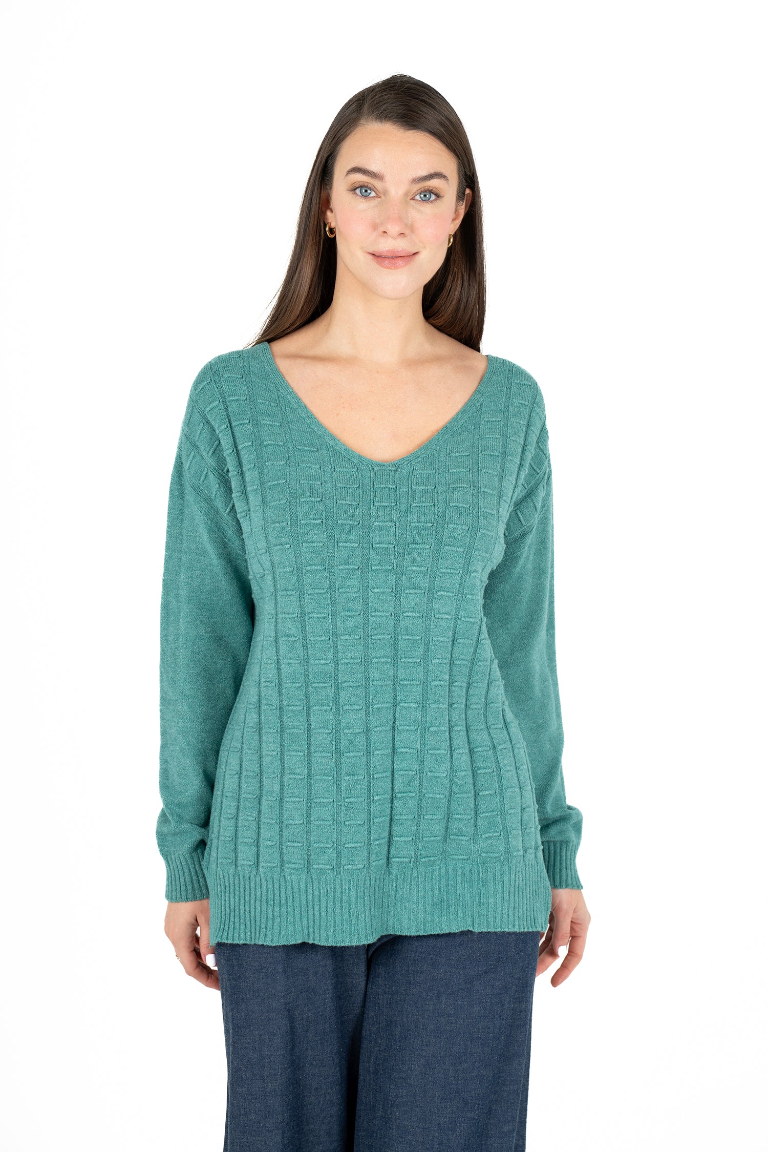 Women's v-neck textured sweater, with a dropped shoulder, long sleeves, a hi/low hemline with side slits. Composition: 52% Viscose, 26% Polyester, 22% Polyamide.