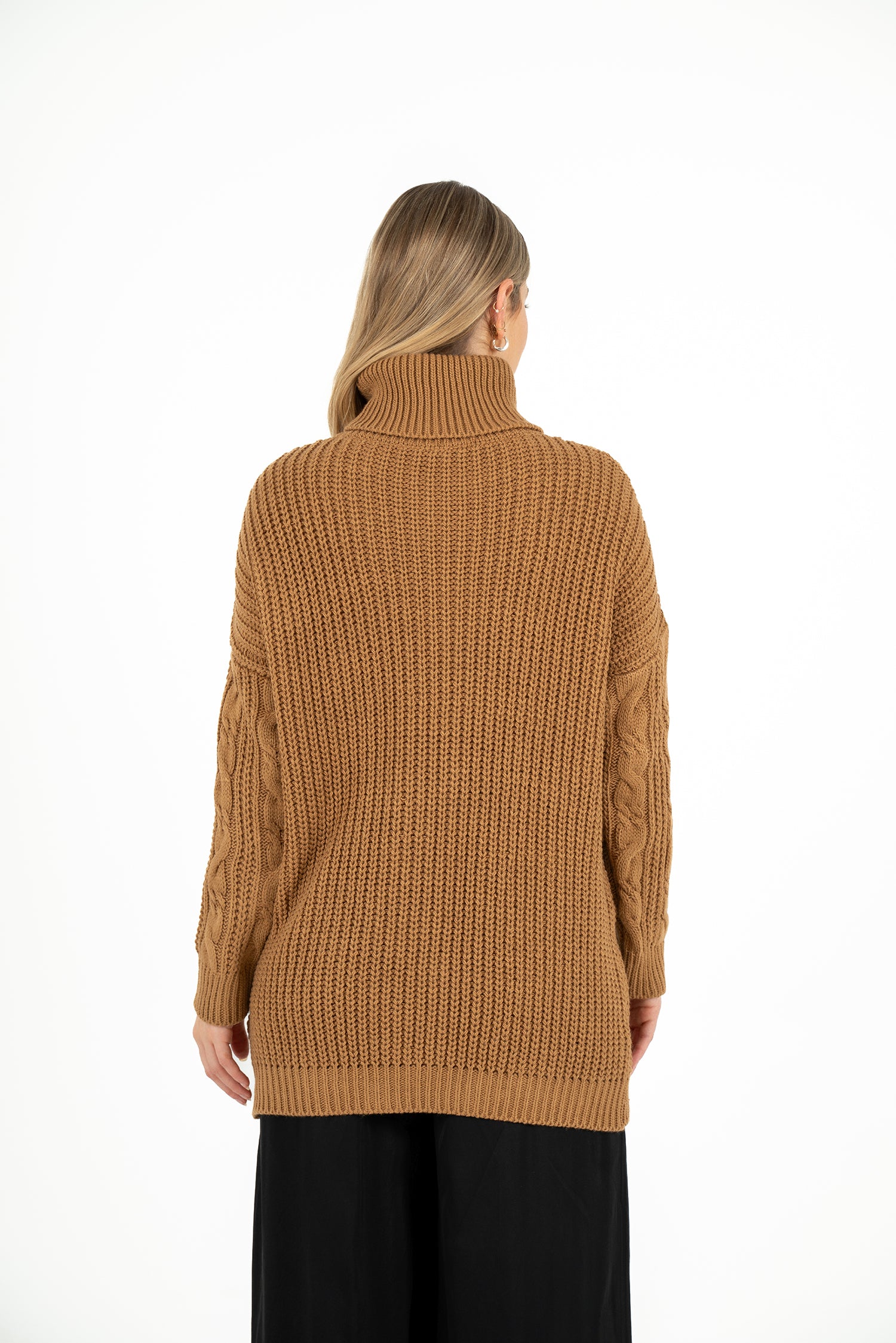 Women's cable-knit tunic length sweater, with a turtle-neck collar, long sleeves and a dropped shoulder.